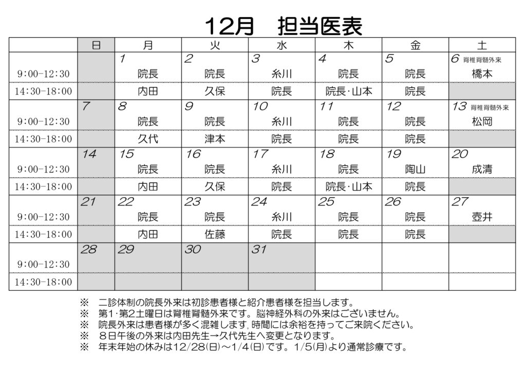 12月8日(月)午後の診療は久代医師(聖マリアンナ医科大学病院脳神経外科)になります。