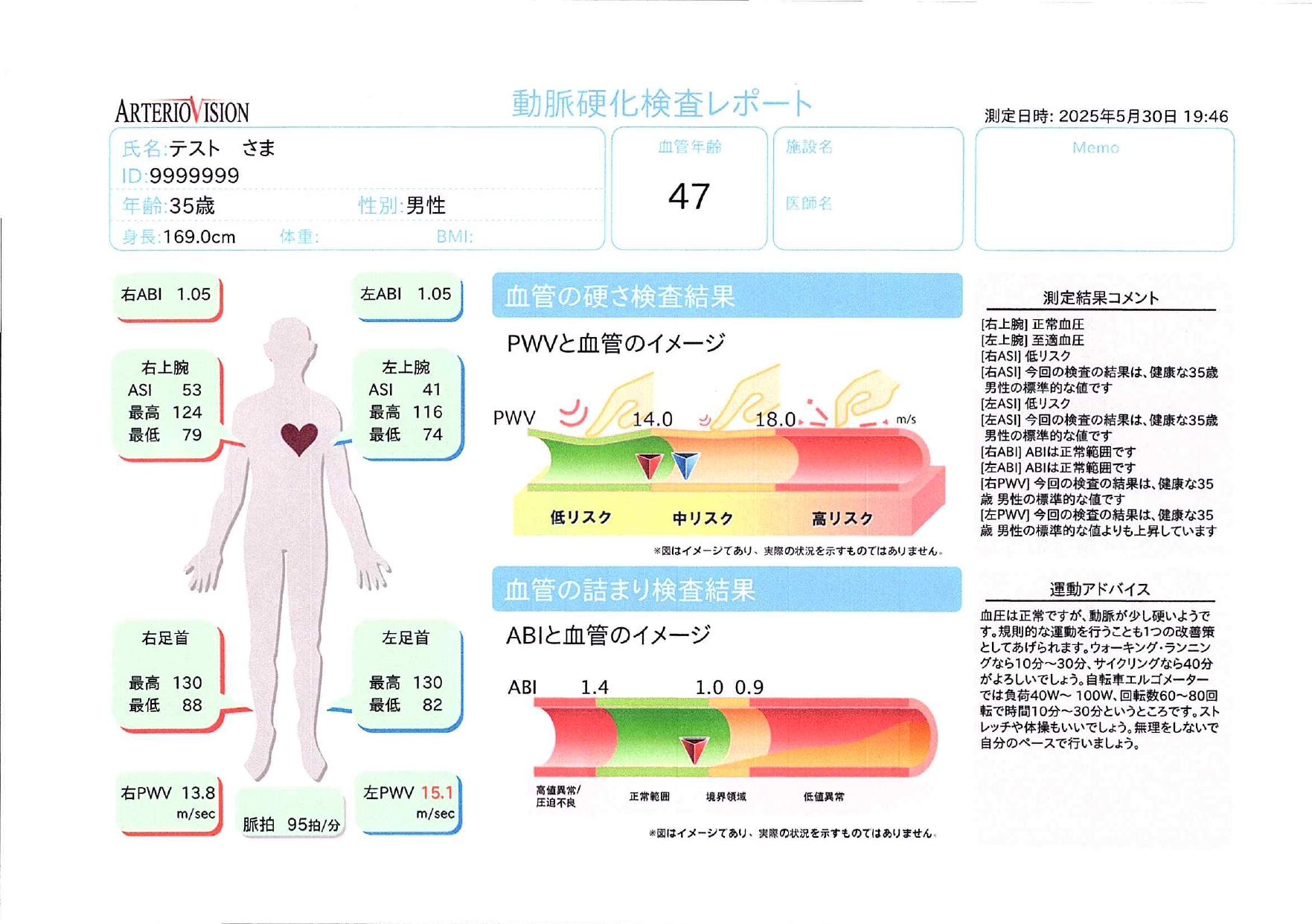 | 目的 | 動脈硬化(血管の硬さや詰まり)の程度を確認する。 |